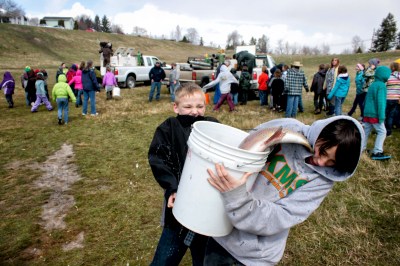 Michael Rutherford, left, and Brady Martinez haul a large rainbow trout from Montana Fish, Wildlife and Park trucks to the Dry Bridge Pond in Kalispell. – Justin Franz/Flathead Beacon