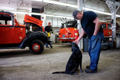 Steve Taylor, head mechanic at the East Glacier shop, takes a moment to great the shop dog, 11-year-old Mabel. In the background, two of the 33 operational Red Buses sits awaiting repairs. – Justin Franz/Flathead Beacon