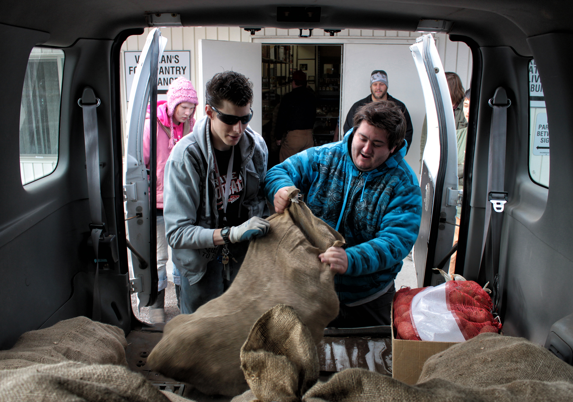 Chad Scheschy, left, helps Donovan Leskovec unload a bag of potatos at the Northwest Montana Veteran’s Food Pantry in Evergreen on Nov. 14. – Justin Franz | Flathead Beacon.