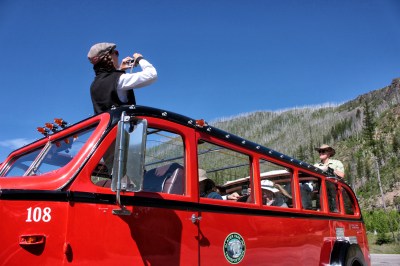 Sherri Camperchioli takes a passenger’s photo at the intersection of the Camas and North Fork roads. Of the 35 Red Buses built for Glacier National Park, 33 operate today. One was preserved in its original condition by the National Park Service and another, No. 100, was lost in an accident. Justin Franz | Flathead Beacon.