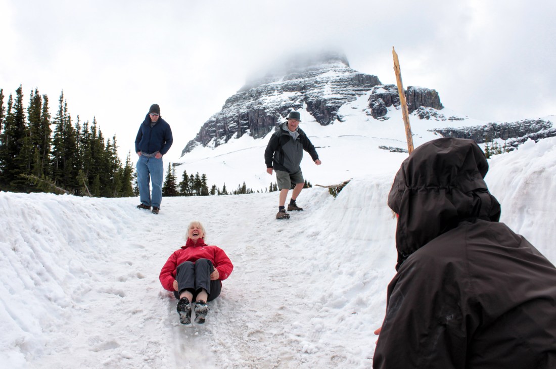 Pauline Morey, center, slides down a snowfield at Logan Pass on the first day all 50 miles of the Going-to-the-Sun Road were open. Morey was traveling from Ireland with a group of friends. Justin Franz | Flathead Beacon.