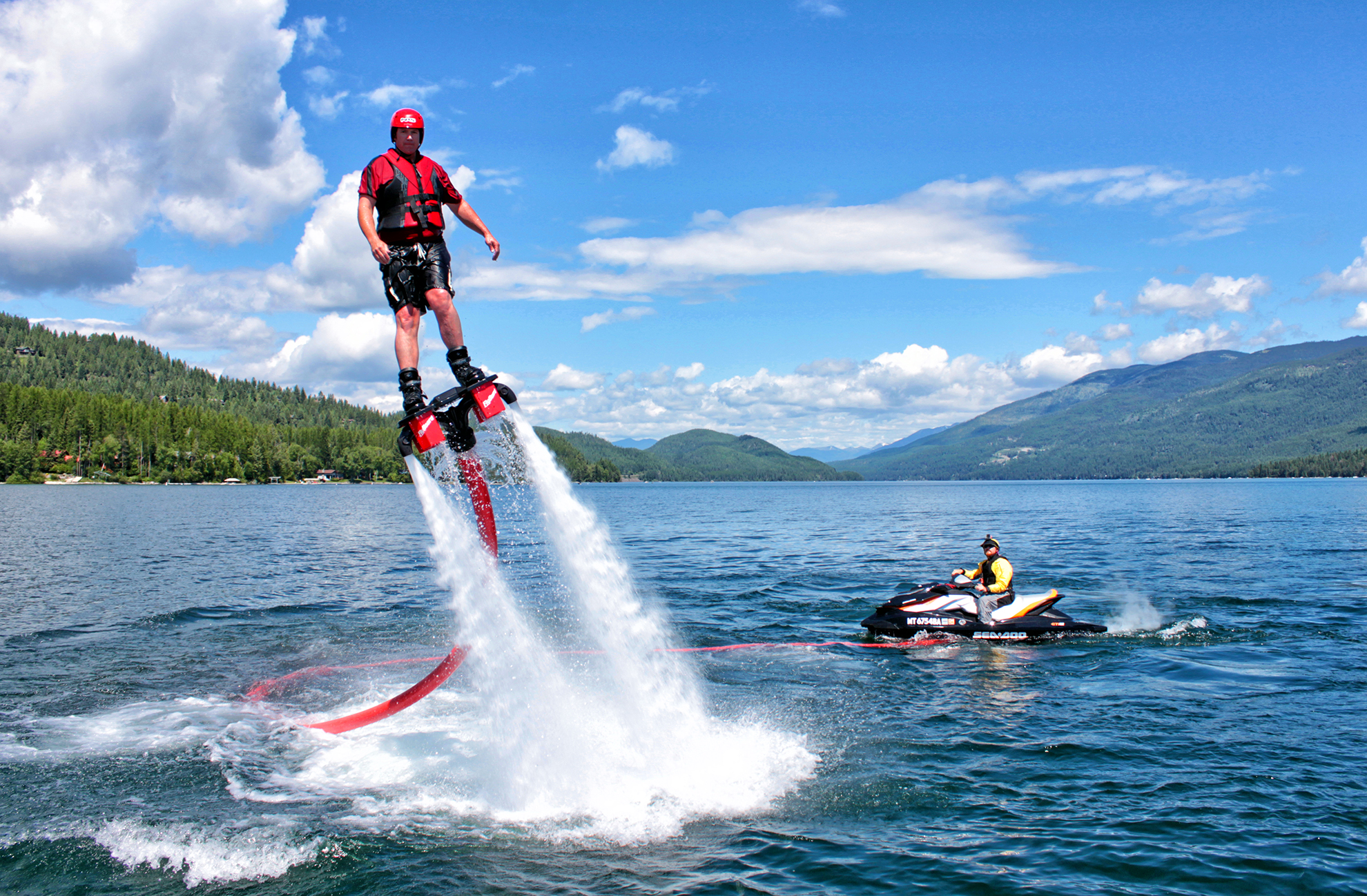 Shawn Finley, left, rides a flyboard on Whitefish Lake. The board is propelled with water from a Jet Ski. Justin Franz | Flathead Beacon.