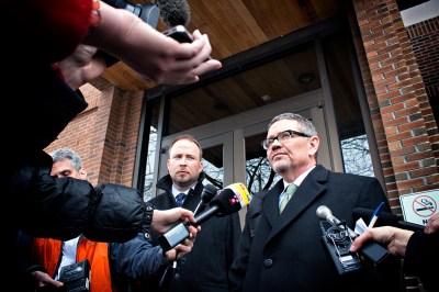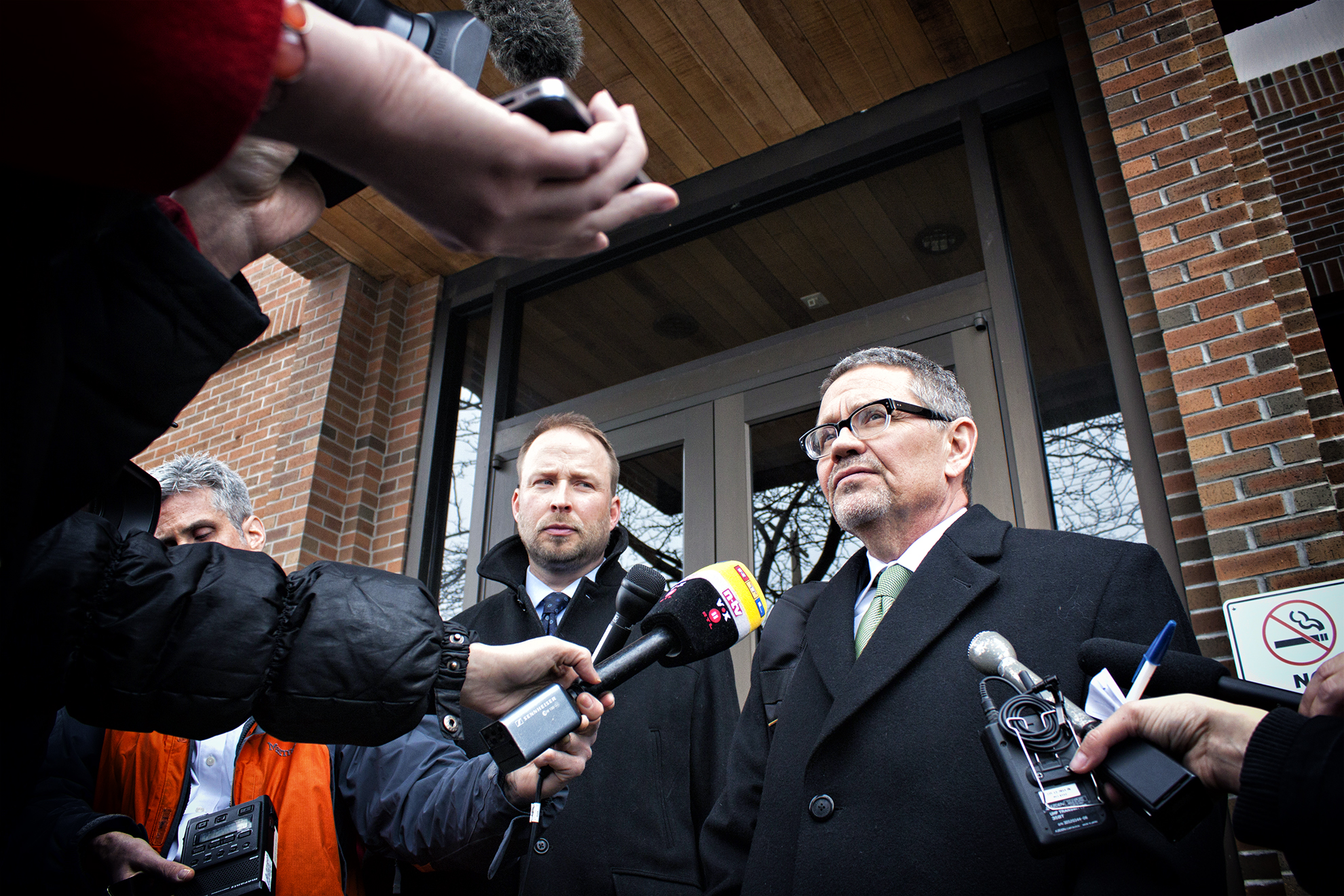 Andy Nelson and Micheal Donahau, attoneys for Jordan Graham, speak to the media Thursday, March 27, 2014, after their client was given 30 years in prison for murdering her husband of eight days in Glacier National Park last summer. Justin Franz | Flathead Beacon